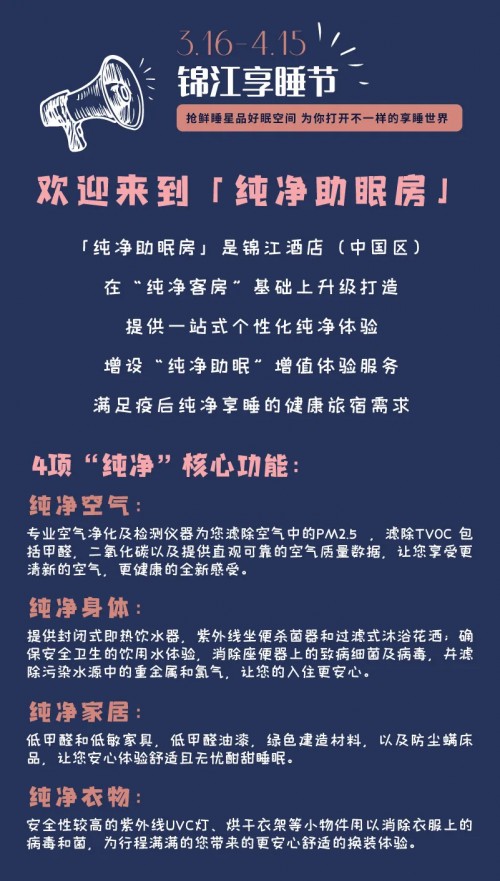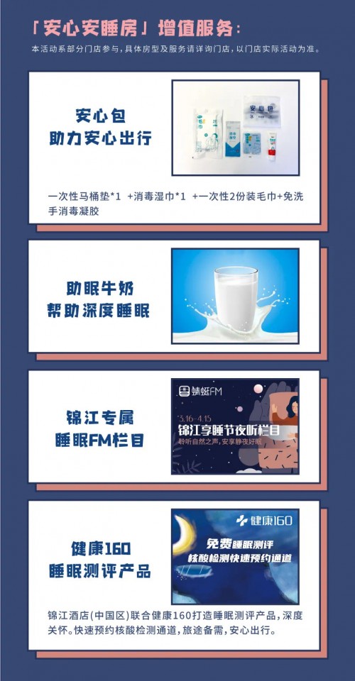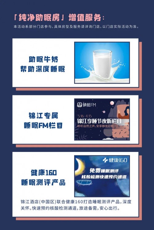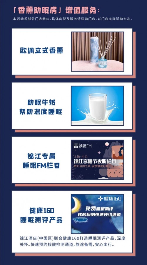 除了床垫和枕头这两项固定的好眠基础设备之外,锦江酒店(中国区)还在3月份推出了”享睡节活动”,其中,有安心安睡房、香薰助眠房、纯净助眠房可选择,在锦江酒店(中国区)下属品牌维也纳、维也纳国际、维也纳3好、维也纳智好、丽柏、丽怡、郁锦香、凯里亚德等多个品牌,约一千家门店,一万七千间客房可供体验,想享受一晚精致睡眠的朋友们不要错过。